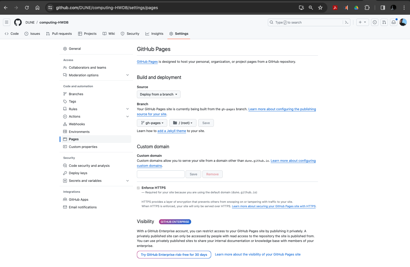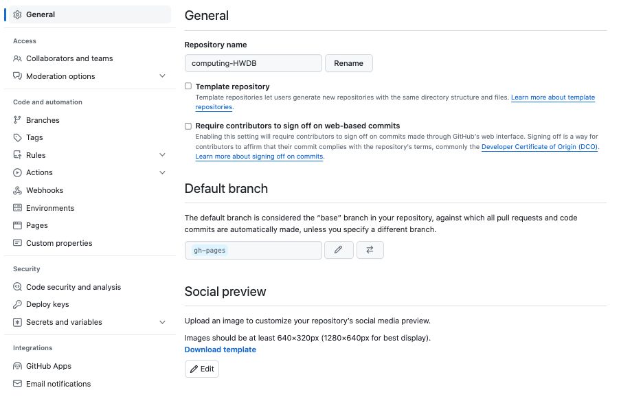 - GitHub settings, set default branch to gh-pages, then delete the main branch.
