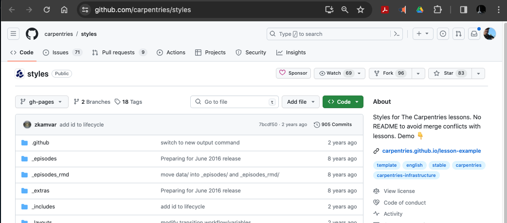 Identify SC lesson template source: Work from the latest version of the lesson template, to verify versioning, visit https://github.com/swcarpentry, and check out the meta-repository to help navigate the lessons and repos of the SC Community: https://github.com/swcarpentry/swcarpentry.