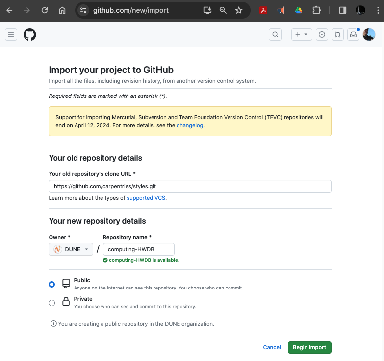 As Your old repository’s clone URL use https://github.com/carpentries/styles.git and Your new repository details DUNE/computing-HWDB ensuring that Repository name is available. Set access to the repository as Public, then select the green Begin import button: