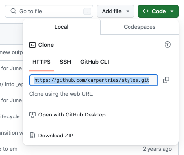 and select the HTTPS link and copy it to your buffer (command C on Mac), that is https://github.com/carpentries/styles.git